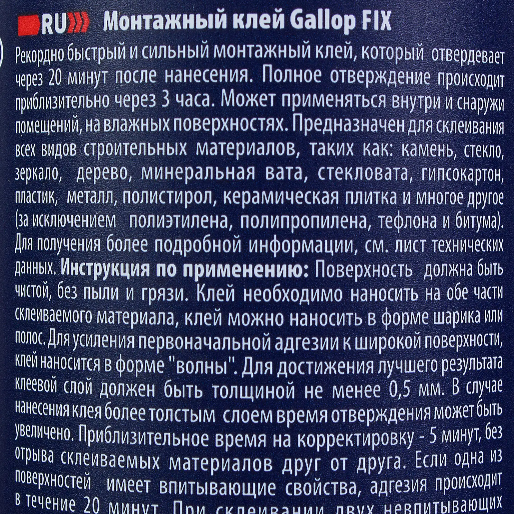 Монтажный клей Tytan Gallop Fix полимерный в виде пасты обеспечивает надежное соединение поверхностей. Состав на основе MS полимера отвердевает за 5 минут, уже через 20 минут допускается нагрузка на клеевой шов. Влагостойкий клей применим на влажных поверхностях. Надежная адгезия и свойства состава сохраняются при температурах от -30°С до +90°С.