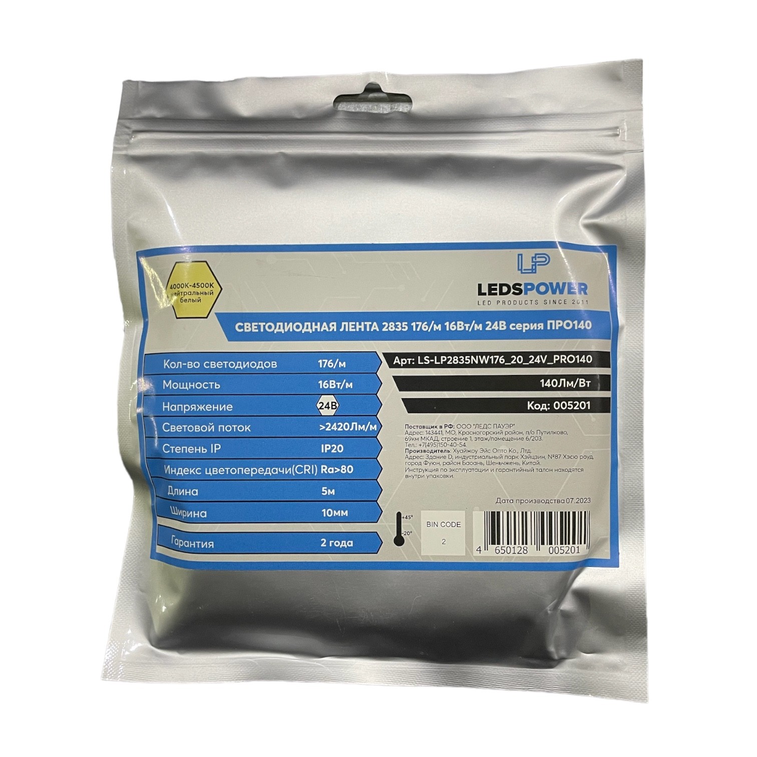 Светодиодная лента LEDS POWER (серия ПРО140), 5м, 24В, IP20, 176 LED/m, нейтральный белый.