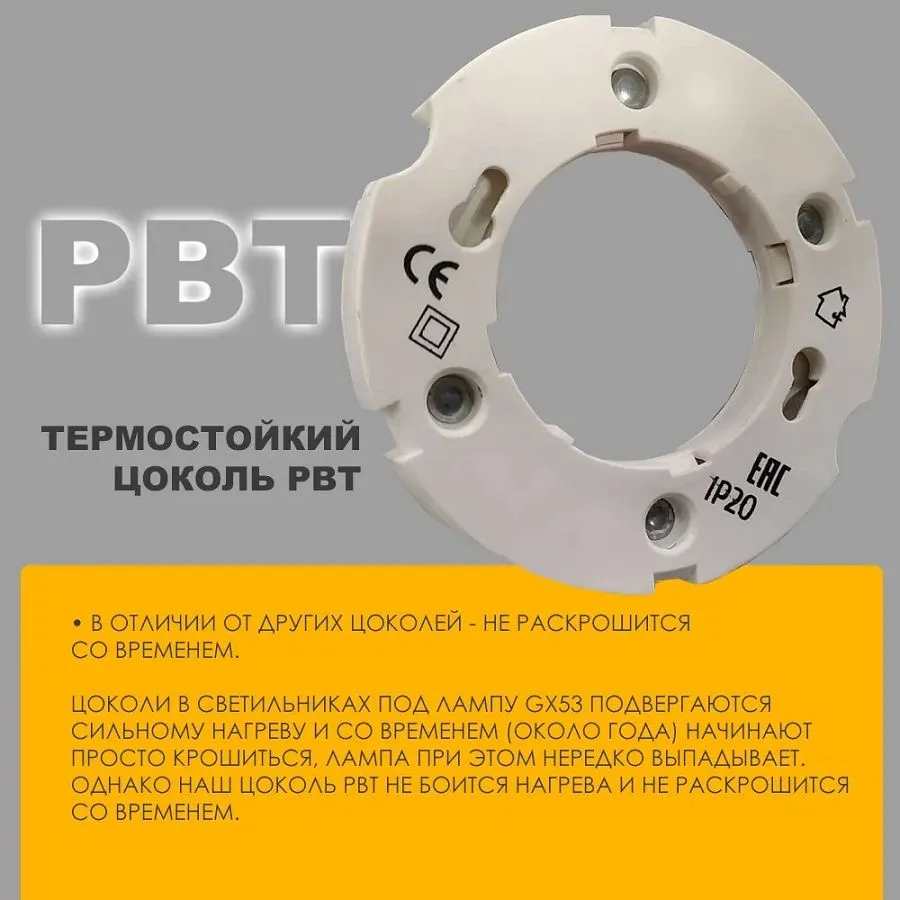 Накладные потолочные светильники этой серии оборудованы термостойким цоколем, который не боится нагрева и не раскрошится со временем. Данная модель под лампу GX53 предполагает возможность легко заменять лампы, что вместе с термостойким цоколем дает долгий срок службы светильнику. Лампа в комплект не входит!